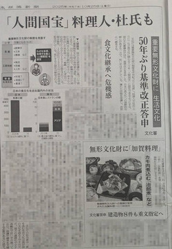 「料理人や杜氏など食文化に関わる人々を 「人間国宝」に認定できるようにする。」 「生活文化」であるのかどうかは疑問だが、 悪い方向ではないのだ···